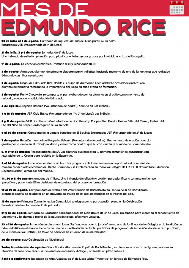 AMPLIAR PastoralLa propuesta pastoral de nuestro Colegio sigue las líneas de la Arquidiócesis de Montevideo. Está centrada en el anuncio del Reino, proclamado por Jesús y nos lleva a descubrir al Dios vivo que comparte la historia de su pueblo. Queremos ser discípulos de Jesús, testigos de su Evangelio y misioneros portadores de una Buena Nueva para todos. Nos inspiramos en la vocación y carisma de Edmund Rice, fundador de los Christian Brothers, quien nos convoca a la solidaridad vivida cotidianamente como presencia compasiva y liberadora de los menos privilegiados.
